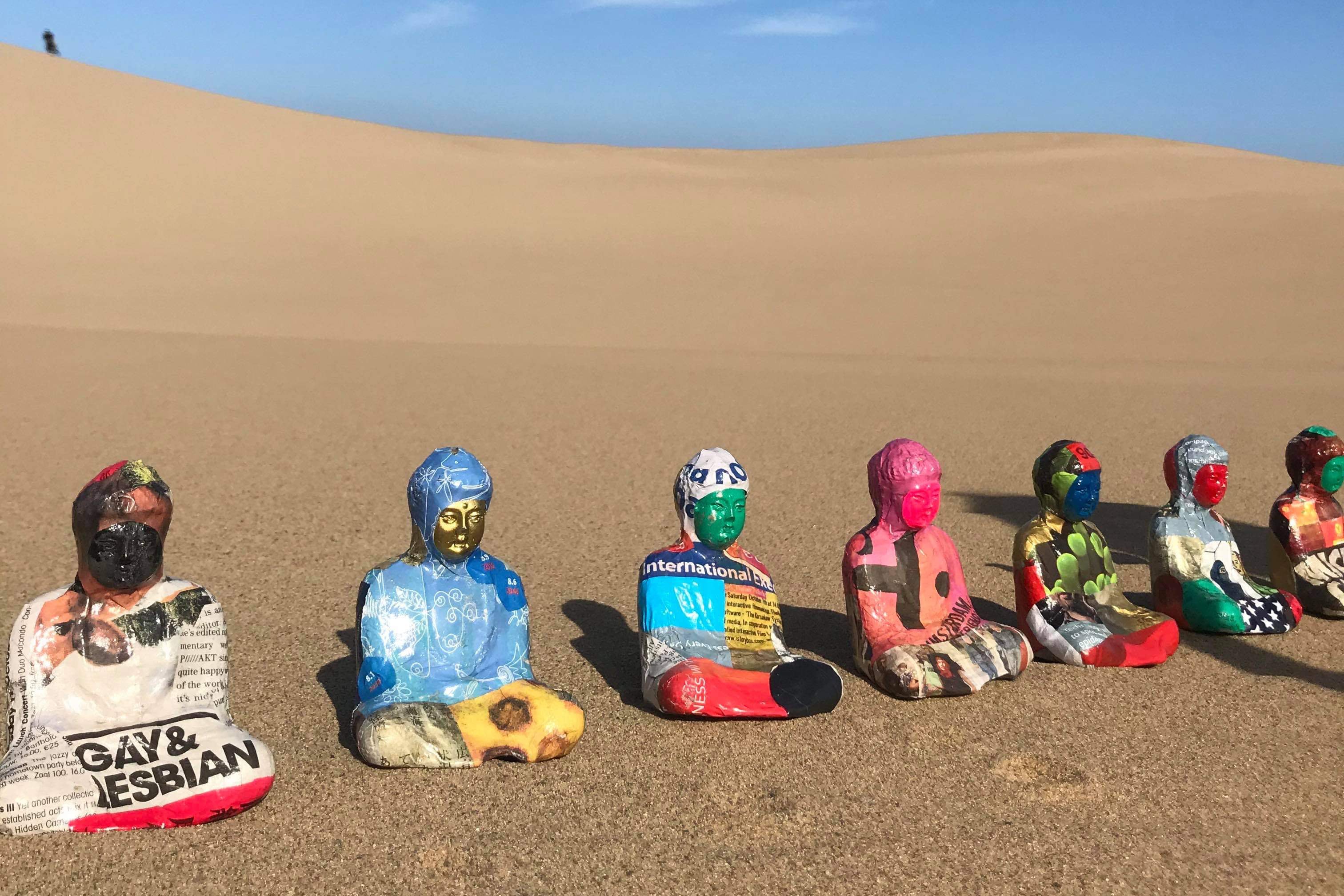 手のひらサイズのミニ大仏に、チラシや新聞記事、雑誌などの印刷物を貼り付けて作るオリジナル大仏のワークショップキットです。